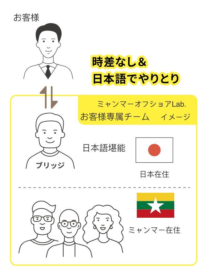 日本在住の日本語の堪能なミャンマー人(N2保持者)がブリッジとなります。そのため、現地在住のブリッジと比べ時差もなく、コミュケーションをスムーズにとることができます。日本オフィスでの実務経験が長く、日本での開発方法を熟知しております。